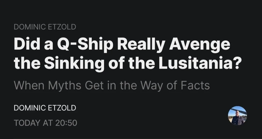 In the meantime, I created a Substack account and will be posting various articles of interest. The first one deals with the myth regarding a British Q-ship sinking SM U-88 and in turn, avenging the sinking of the Lusitania, but there will be more - particularly regarding research I’m doing for my third book. You can click on the image below to access it. Currently, the account is free (and I hope to keep it that way), but we’ll see how it goes.
